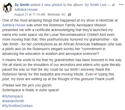 Deeply moved by her music and the accomplishments of her grandmother, the Robinson Family sought to honor Sy Smith and Ida Van Smith. In 2008, the Robinson Family had the opportunity to honor Ida Van Smith by sending her name towards the stars via NASA’s Lunar Reconnaissance Orbiter (LRO). Similarly, in 2018, the Robinson Family honored Sy Smith with the launch of the InSight Mars Lander by sending her name aboard the mission. Willie, Adriana and Victoria Robinson believed that the contributions made by Ida Van Smith and Sy Smith deserved a commemoration amongst the stars.